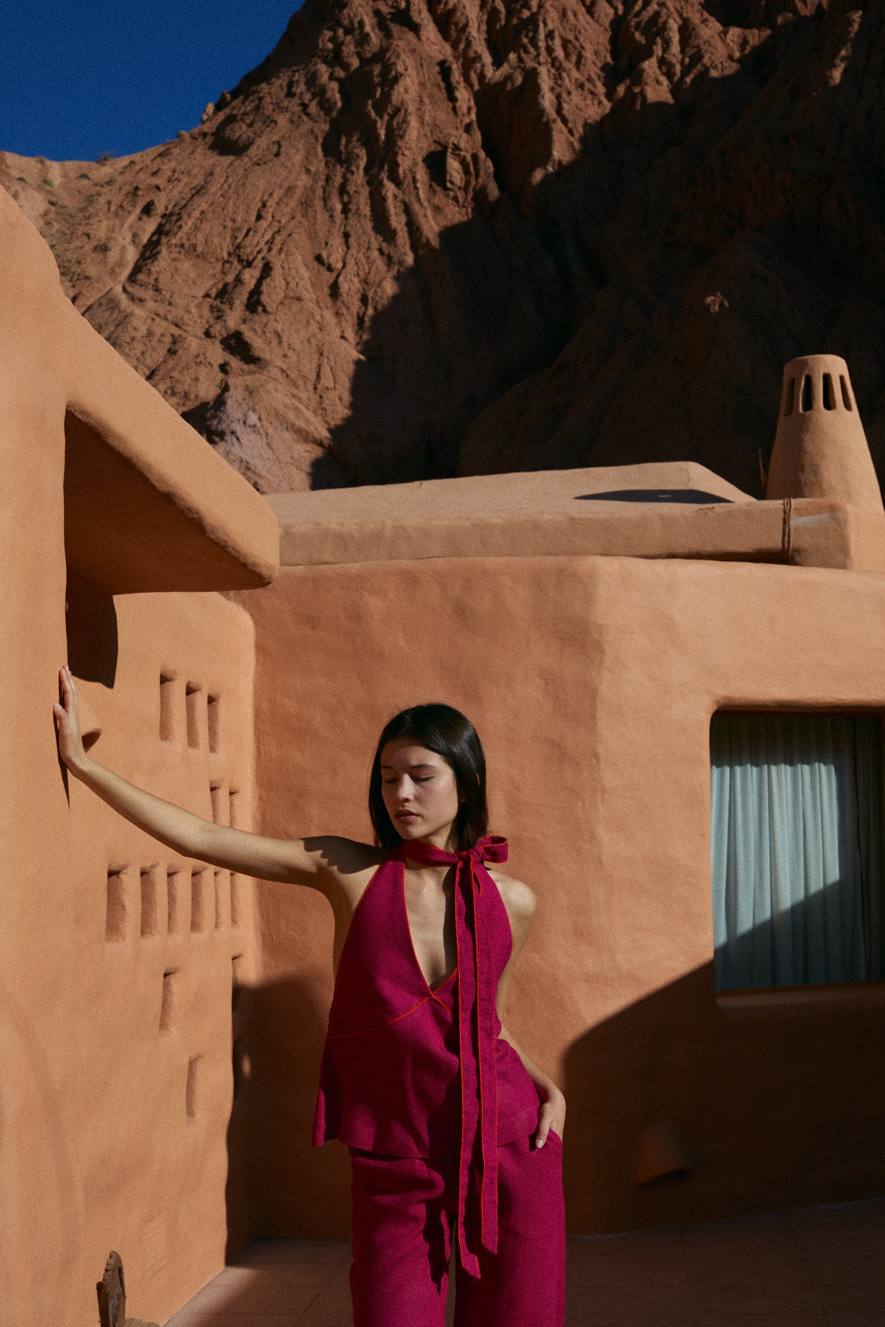 The Estela top is crafted with our signature linen. Featuring a V neck, has a long strap that ties on the neck and can be style in different ways. With a contrast colour piping, this top is very versatile and fresh for those warm summer days.