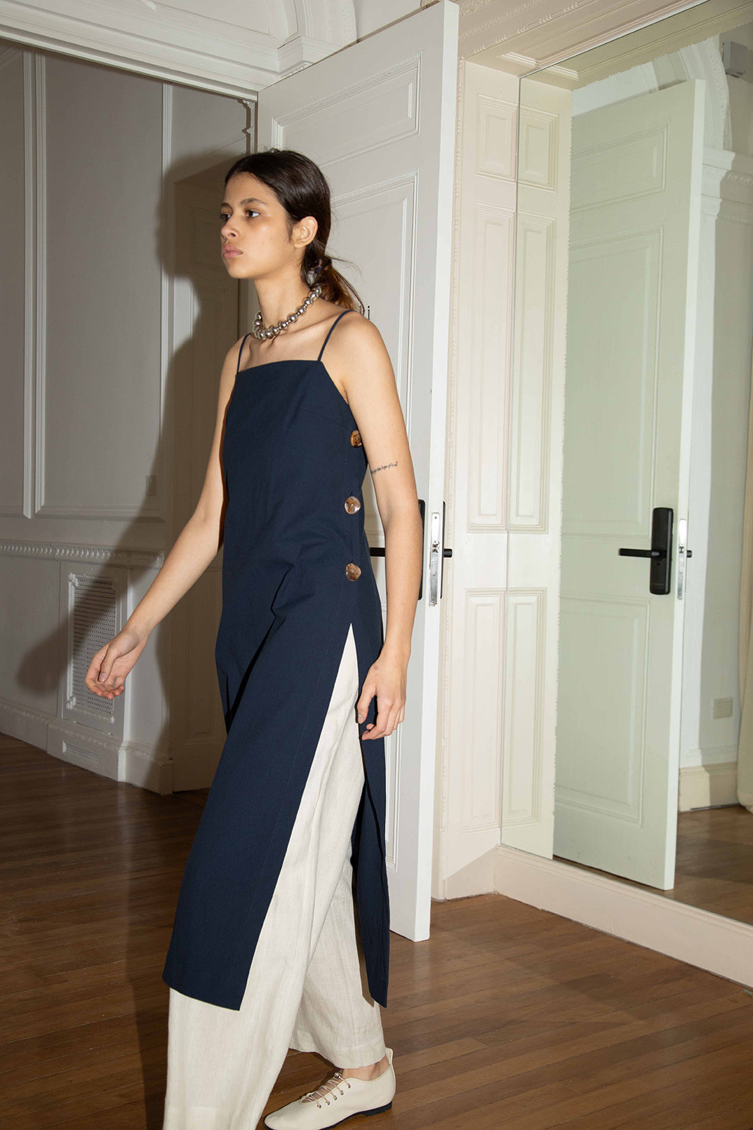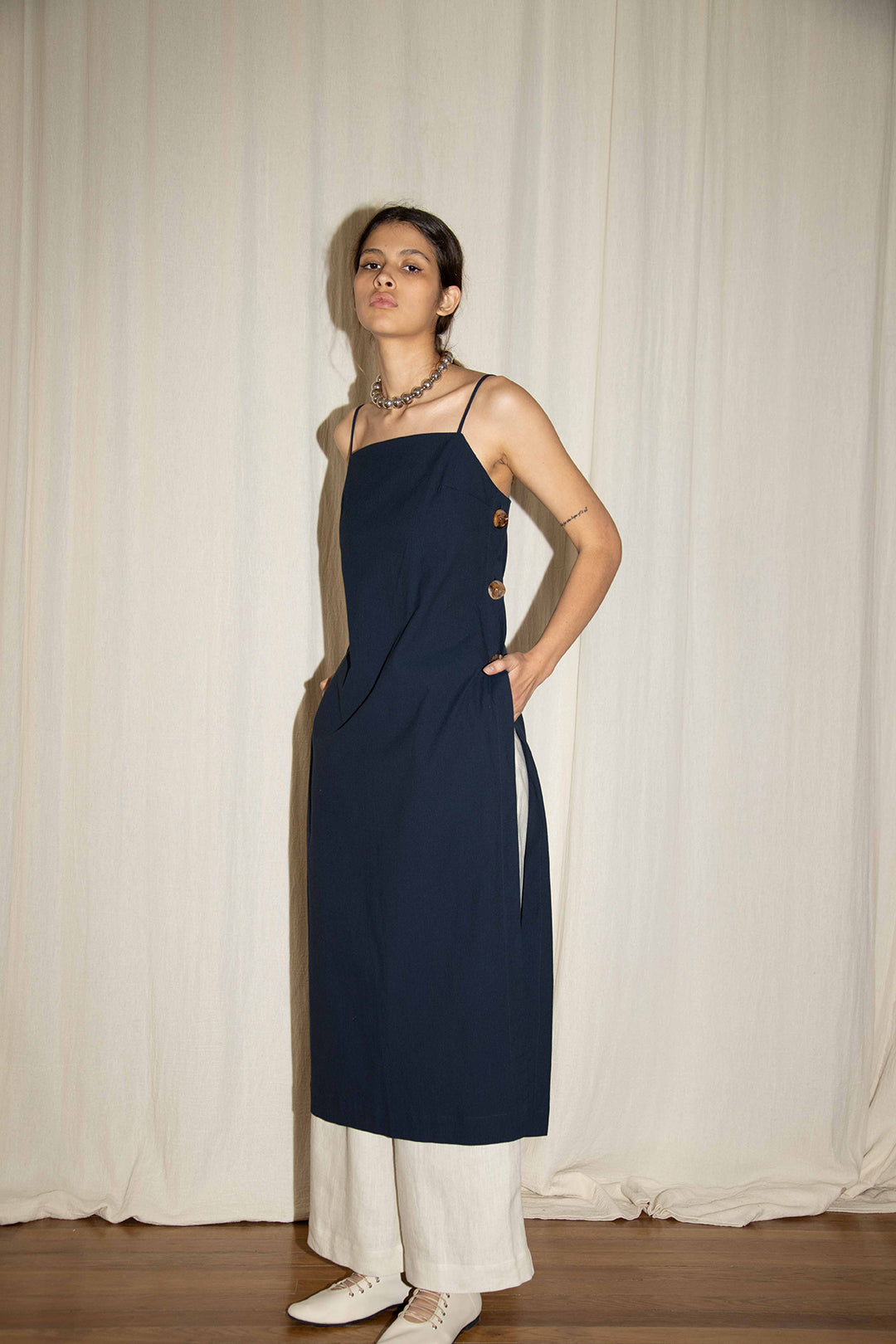 The Manu top is a long top that has slips on both sides with statement buttons to adjust the opening , it has thin adjustable spaghetti straps and a square neckline.
