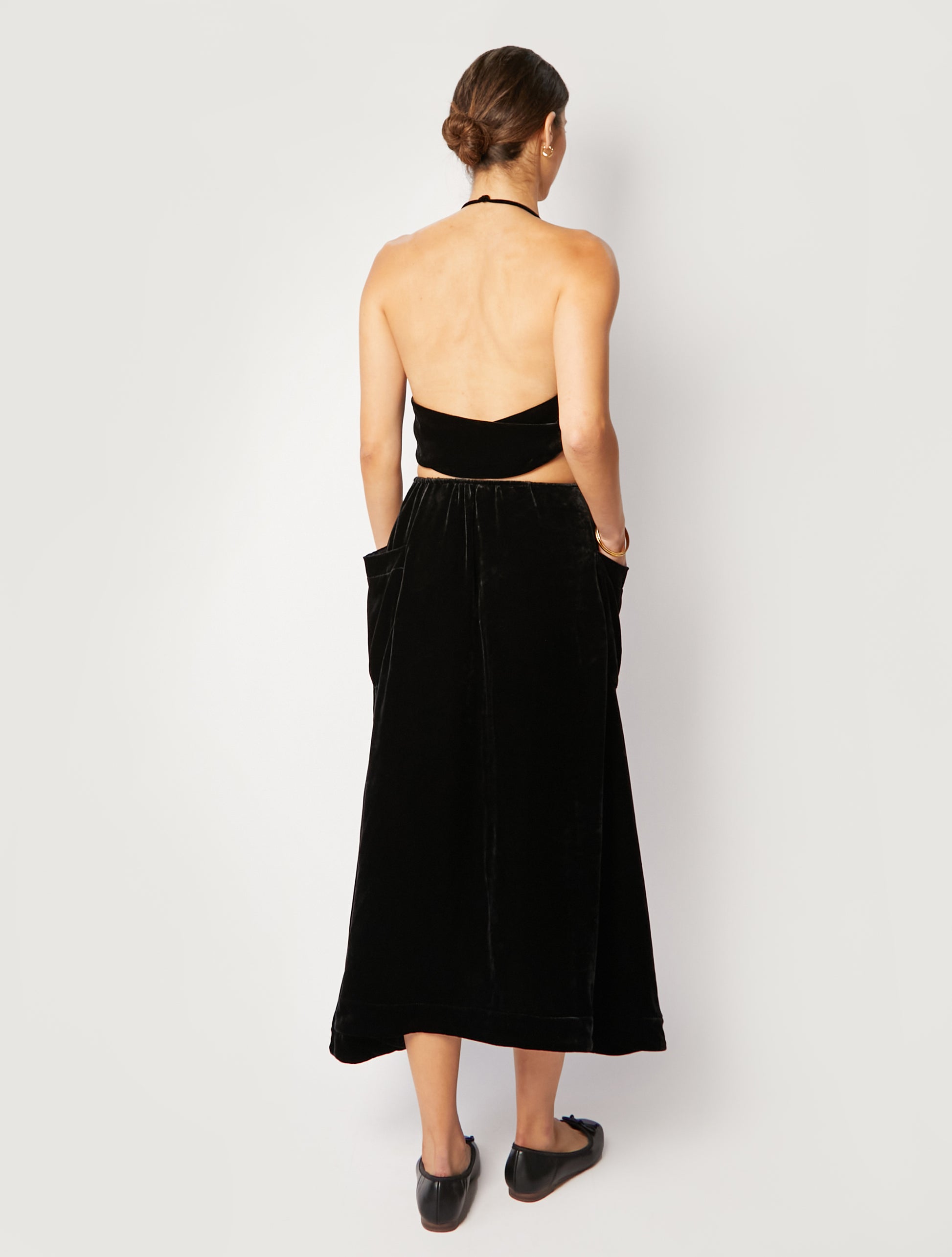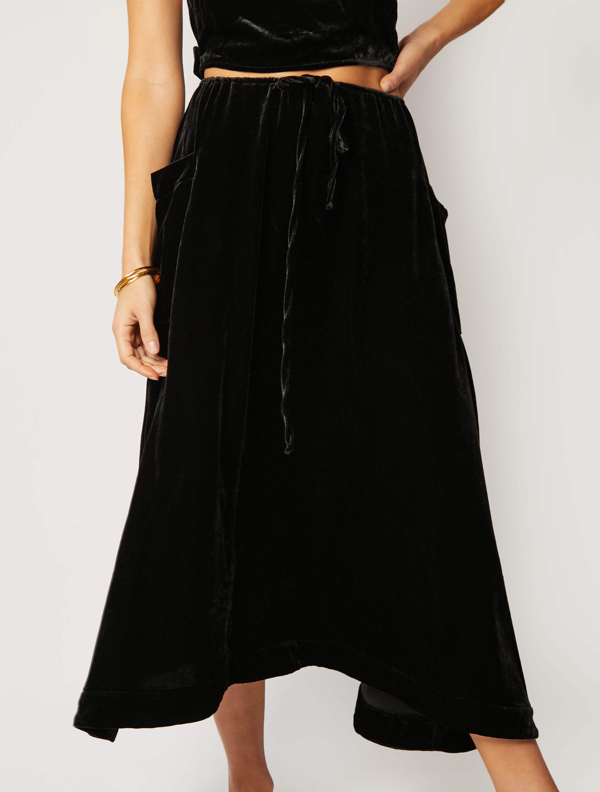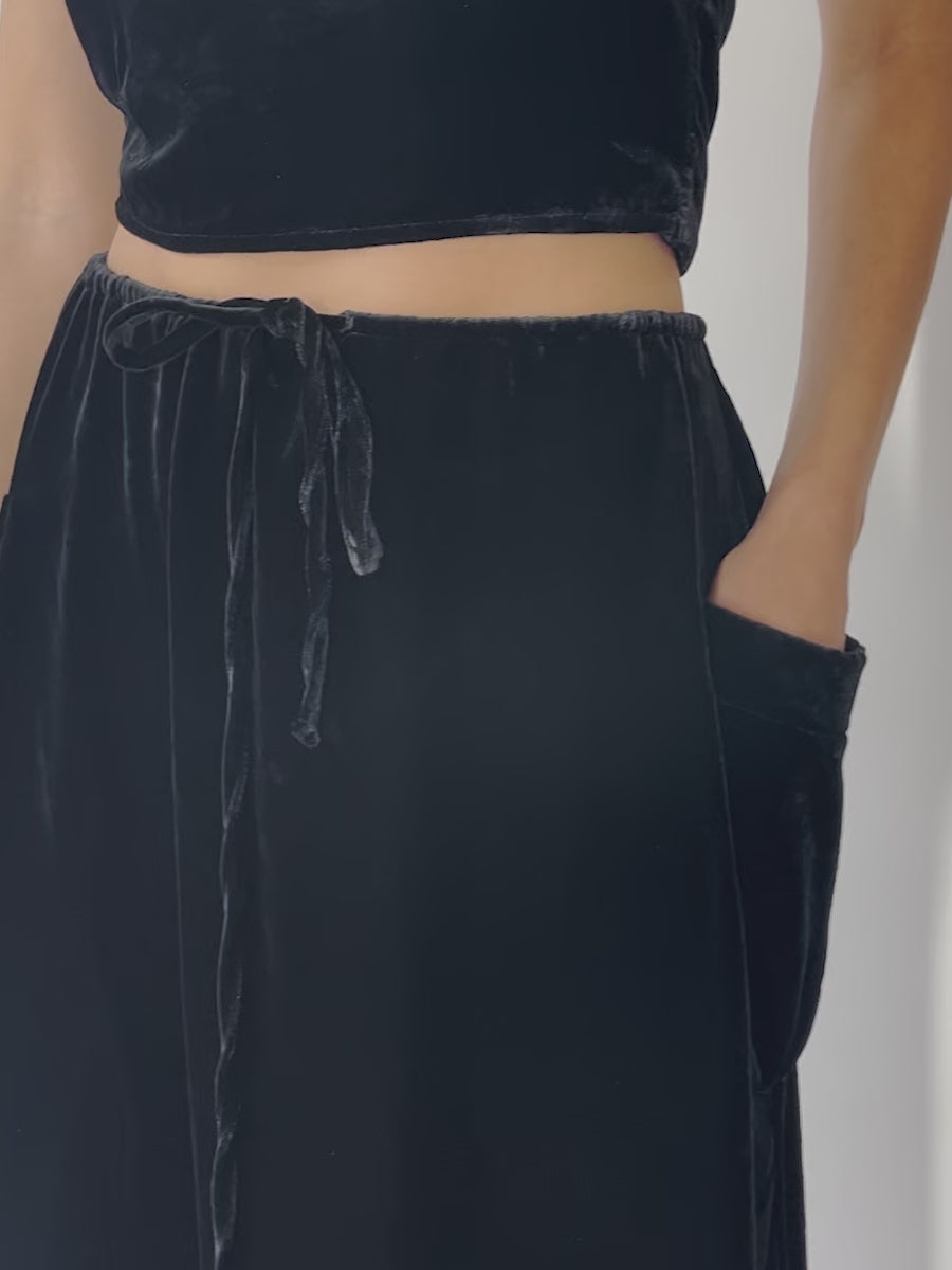 The Sol midi skirt offers a relaxed mid-rise fit, side pockets, and a mid-length design. Our new velvet material offers a luxurious look and feel and provides a timeless elegance suitable for any occasion.
