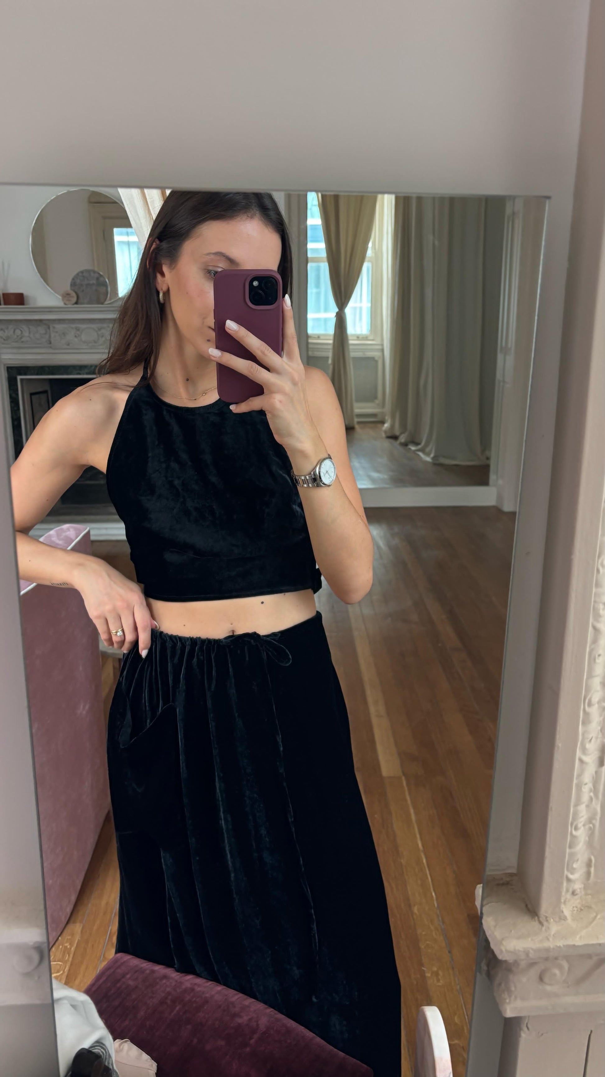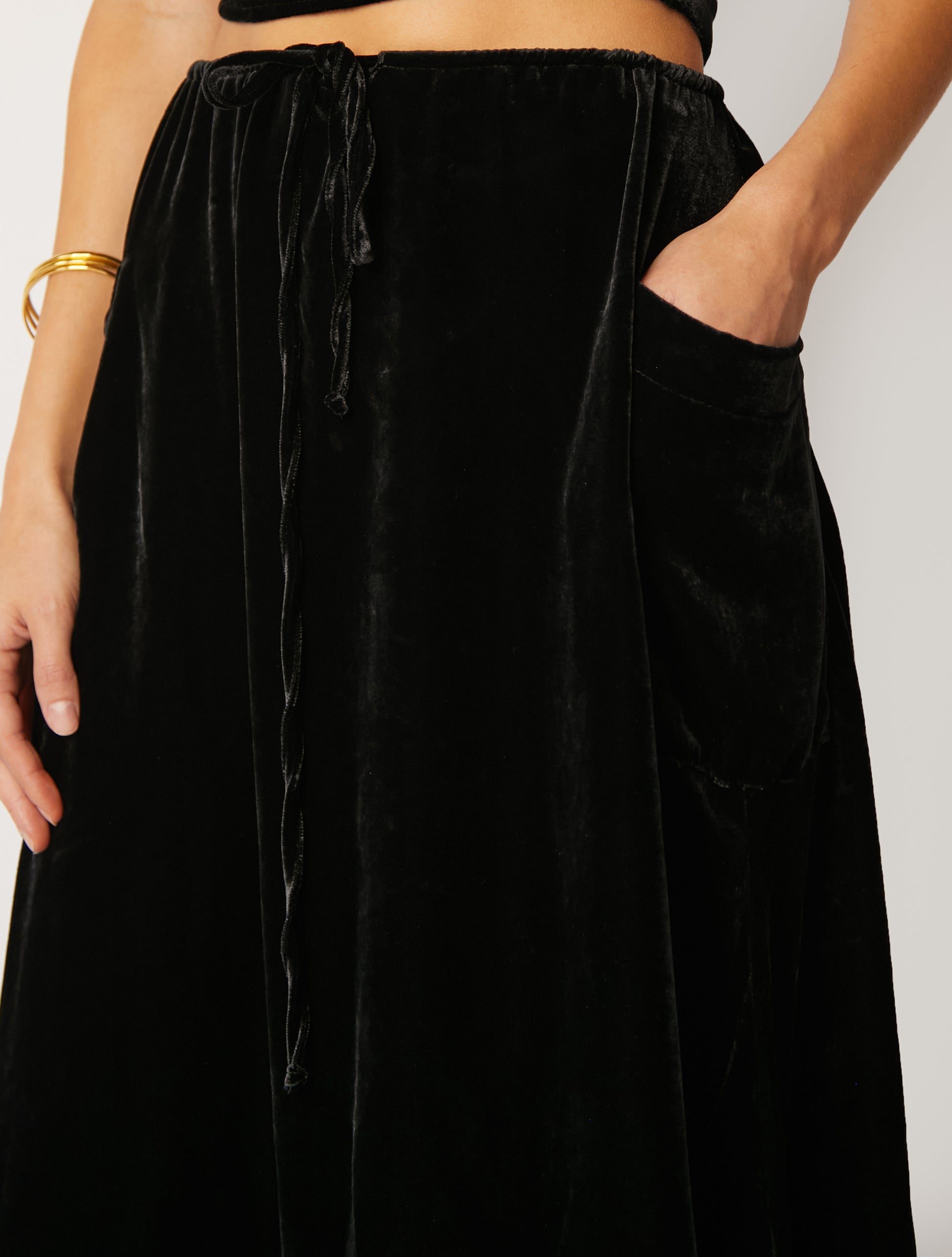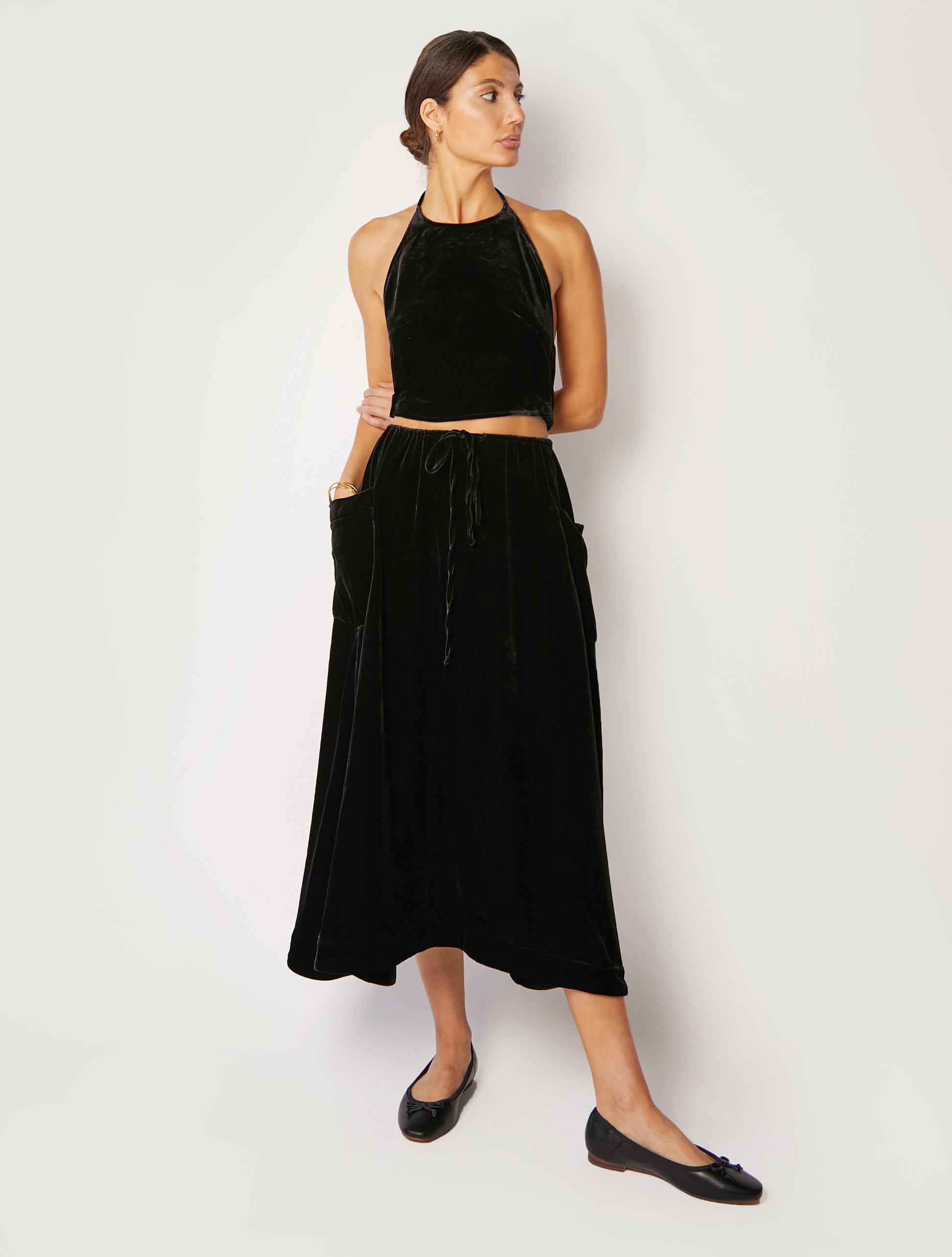 The Sol midi skirt offers a relaxed mid-rise fit, side pockets, and a mid-length design. Our new velvet material offers a luxurious look and feel and provides a timeless elegance suitable for any occasion.