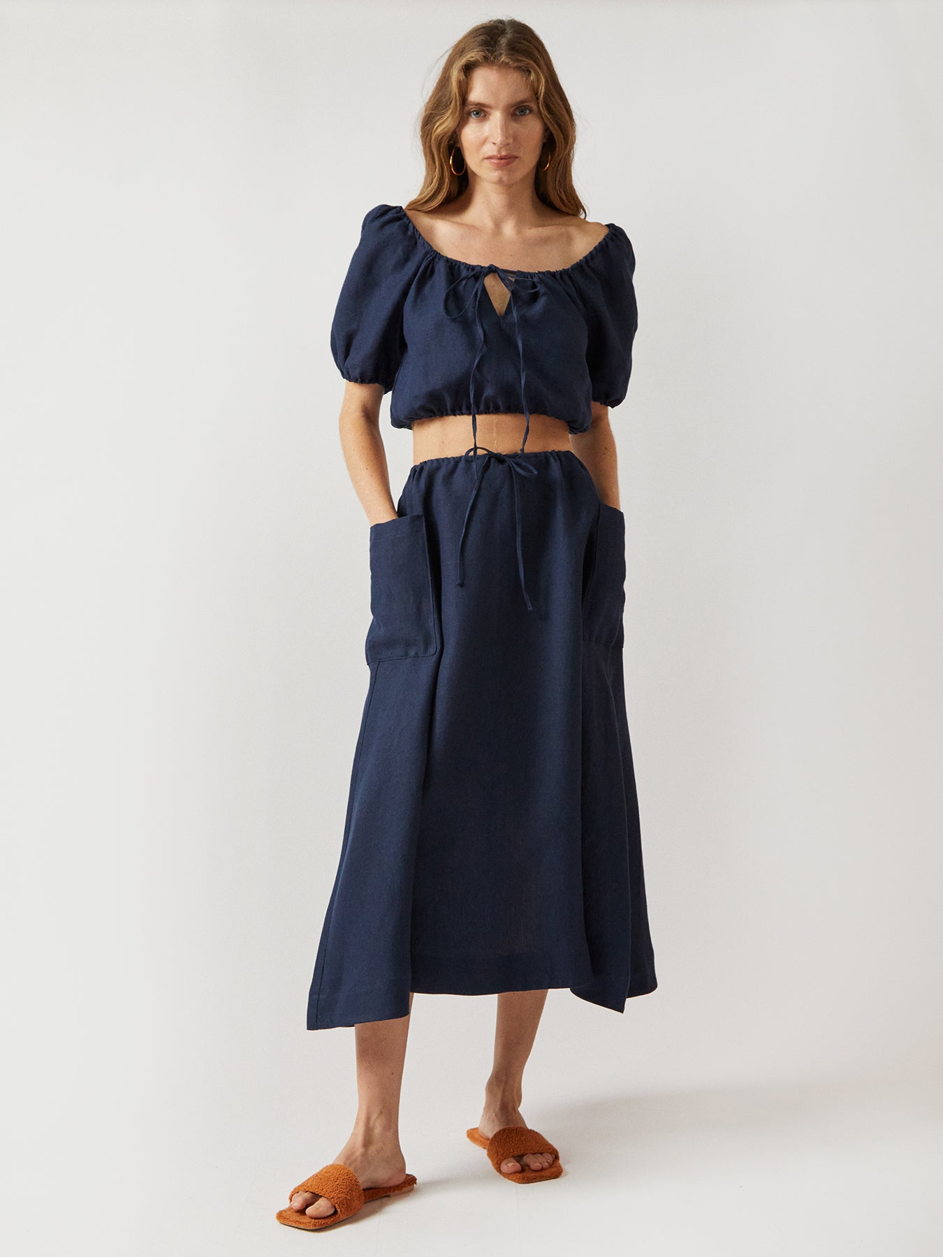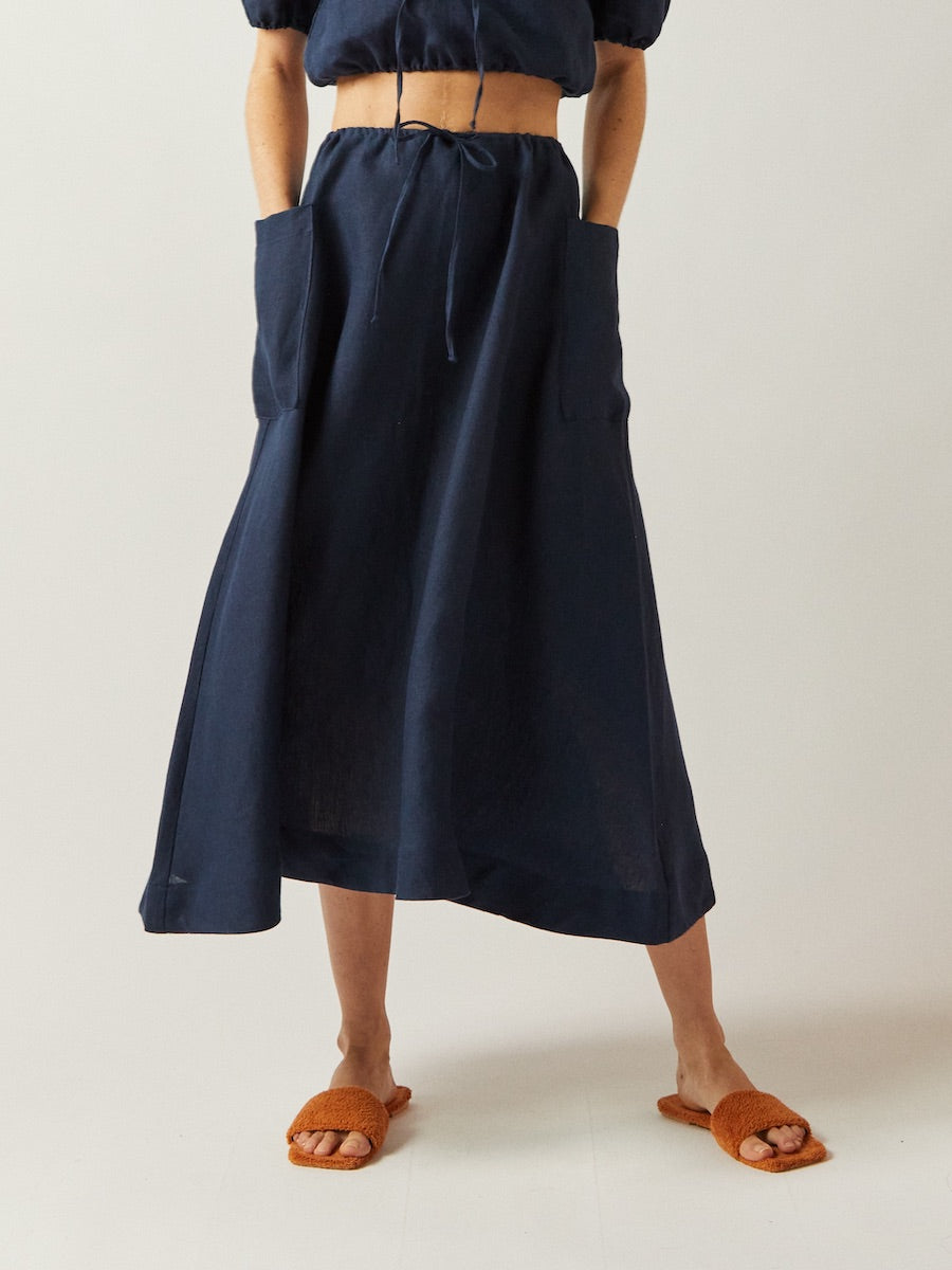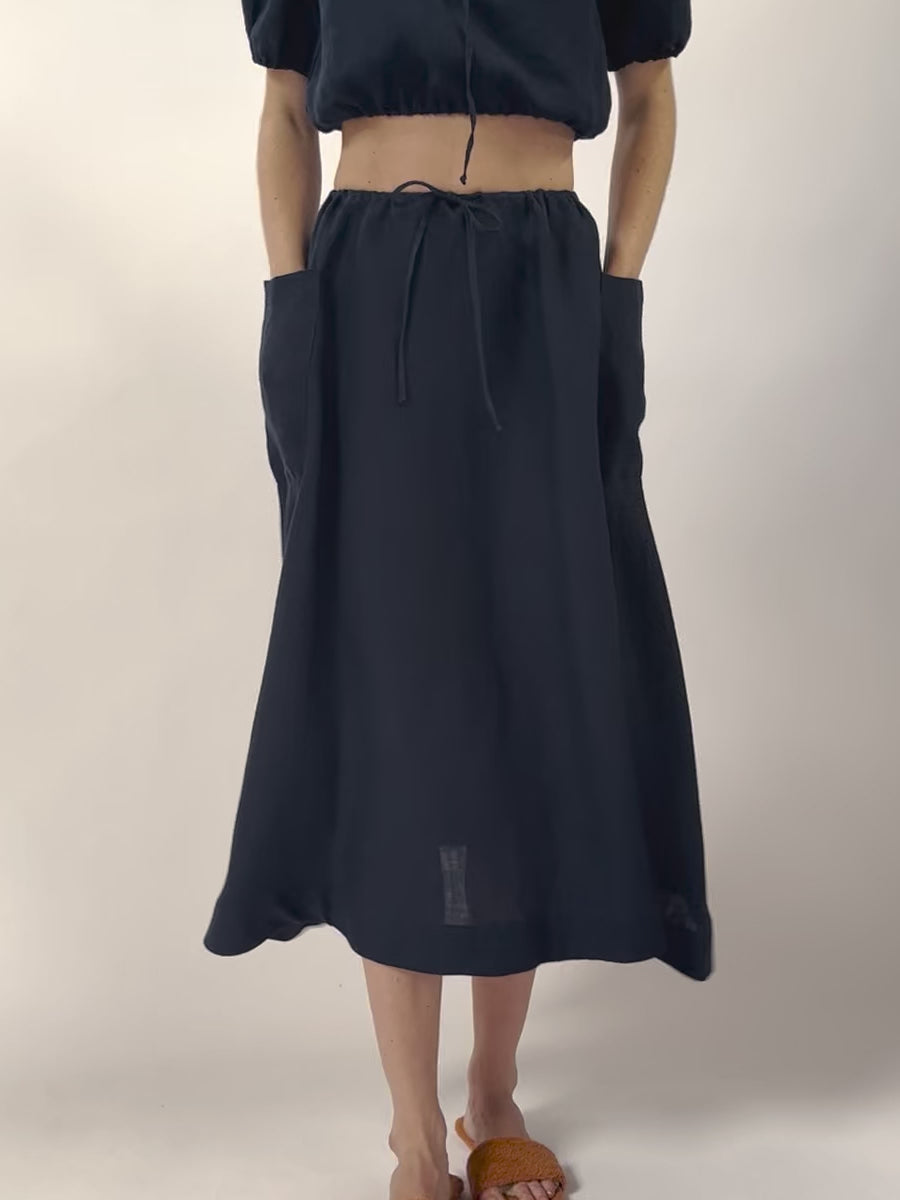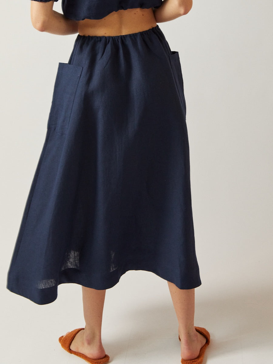 The Sol midi skirt is a fresh mid-length skirt with side pockets. It's made from lightweight, breathable fabric for a comfortable and stylish fit. Ideal for everyday wear or special occasions.